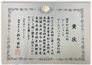 当社の「ピーチジュース(ストレート)」が最高賞である『農林水産大臣賞』を受賞しました。